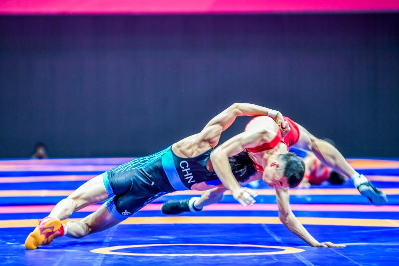 3张12米x 12米的正方形摔跤垫上,一场“荷尔蒙”十足的摔跤大战在临安区体育文化会展中心火热开赛。来自全国各省(市区)的59个代表队、1200余名运动员齐聚于此,展示速度、力量、智慧和勇气。比赛共持续6天,总计产生30枚金牌。