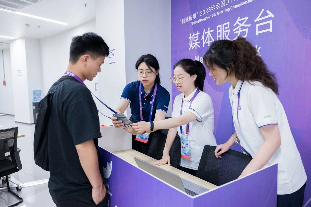 “韵味杭州”系列赛事自5月以来密集举办,作为杭州亚运会前的一次“模拟考”,这些比赛检验着杭州亚运会筹办工作进展,考验着各个亚运场馆运行团队实战水平,也是为亚运会全面预热的重要平台。6月1日,“韵味杭州”2023全国U17国际式摔跤锦标赛开赛,这也是临安亚运场馆在承办杭州亚运会正赛前举行的最后一场大型体育赛事。鲍承成和团队的每个人分工在各自的岗位查漏补缺,不仅要随时掌握赛事流程是否顺利进行,还要根据赛事细节提升各类服务工作。
