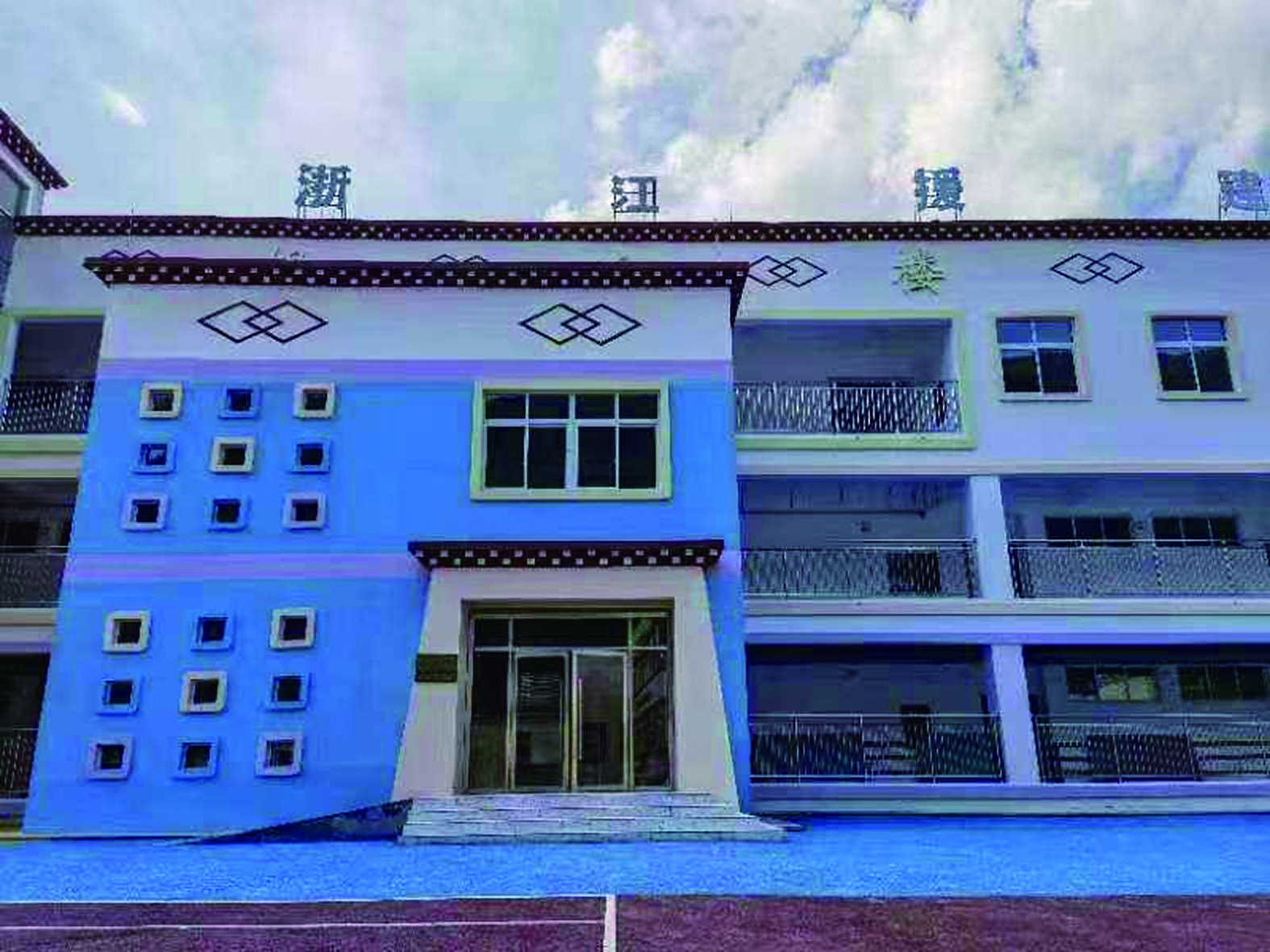 蓝白相间的外墙,充满藏羌风格的门窗和屋檐,映衬着蓝天白云,整幢建筑显得清新又自然。近日,由临安援建的白玉县“赠科幼儿园”正式启用。