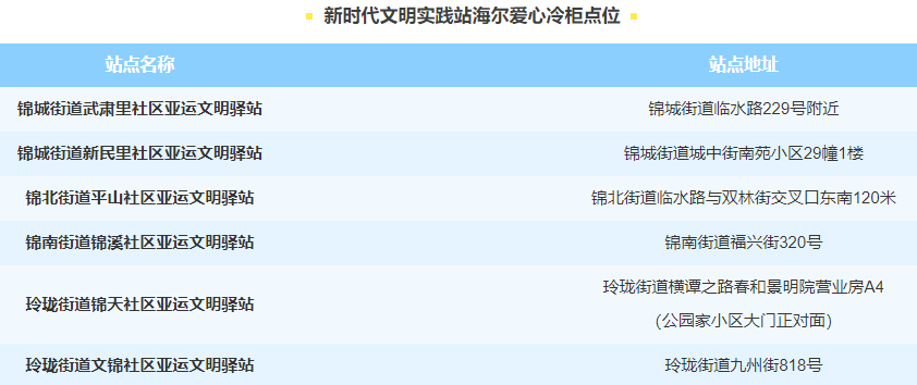 本次 “爱心冷柜”由海尔赞助,锦城街道武肃里社区新时代文明实践站、新民里社区新时代文明实践站、锦北街道平山社区新时代文明实践站、锦南街道锦溪社区新时代文明实践站、玲珑街道锦天社区新时代文明实践站、文锦社区新时代文明实践站等6个点位均设有“爱心冷柜”。