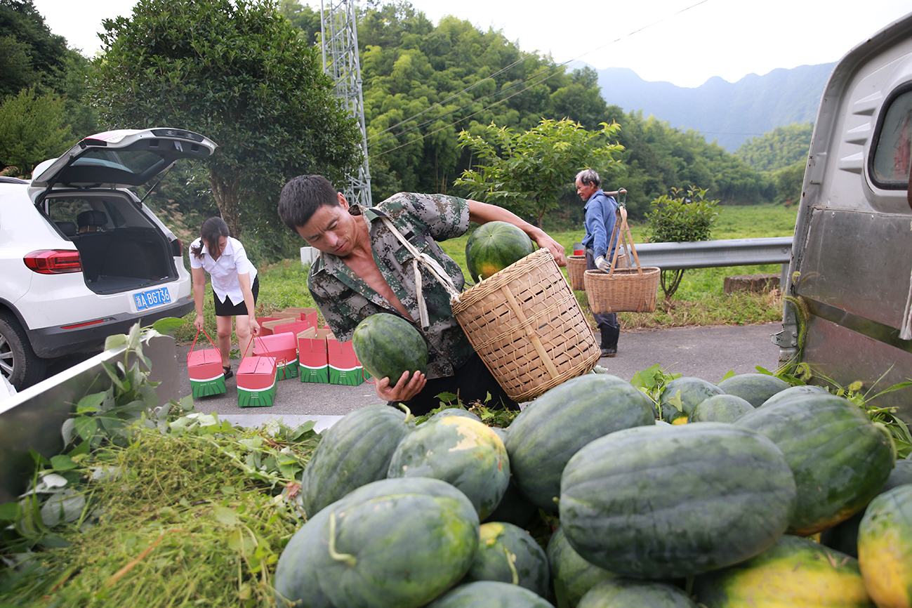 清晨,天还未大亮,潜川镇马山村的西瓜地里已是一派繁忙景象。村民们肩挑、手拿,将载着小山村共富希望的马山西瓜从瓜田里运往路边。装箱、打包,每个10来斤重的马山西瓜被分别装入印有“马山西瓜”商标的礼盒中,这份“夏日清凉”当天就会被送往临安城区,市民可在农创园购买。
