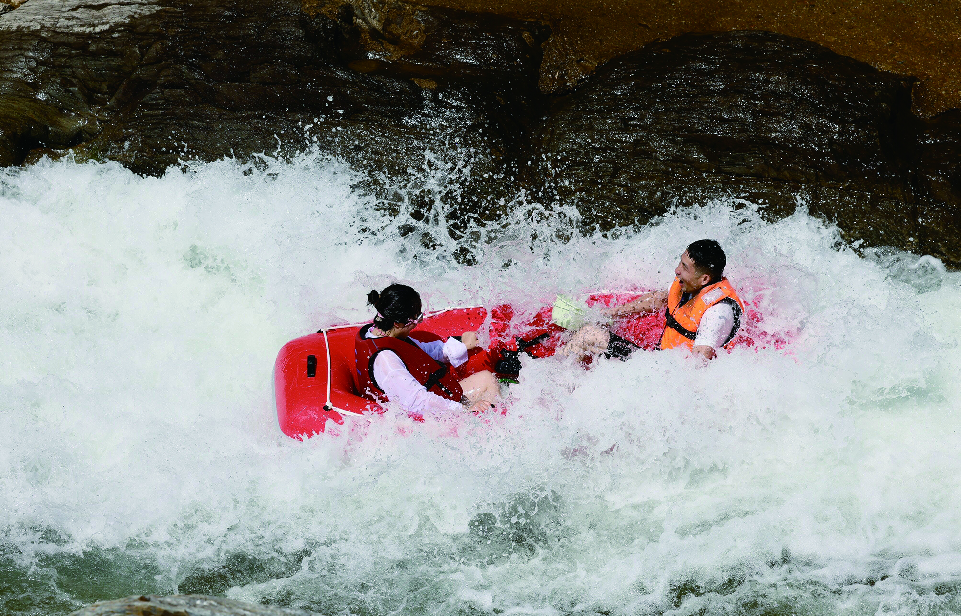在“夏日绝代双漂”中,漂流时长约3分钟的三渡悬崖漂只是“开胃菜”,“大餐”是漂流全长约3公里,垂直落差128米,时长约1个半小时的龙井峡漂流。