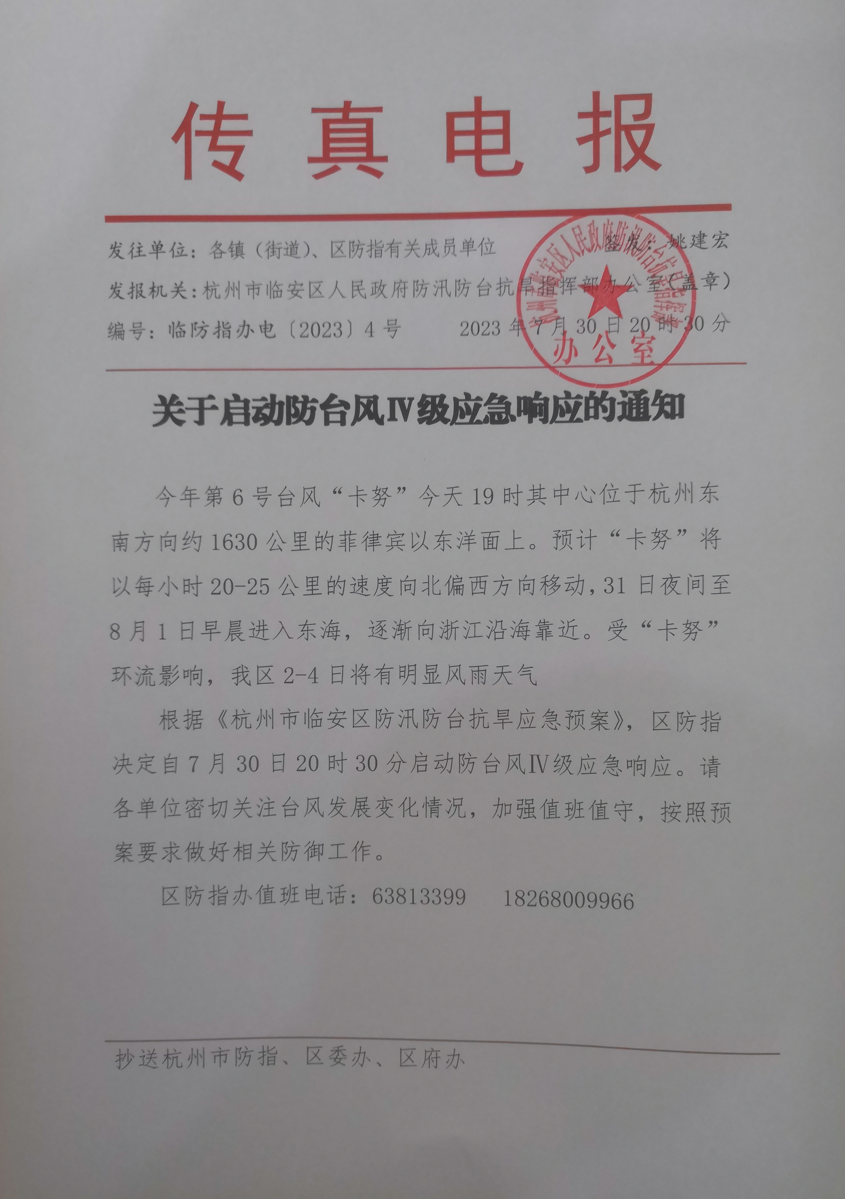 根据《杭州市临安区防汛防台抗旱应急预案》,区防指决定自7月30日20时30分启动防台风Ⅳ级应急响应。