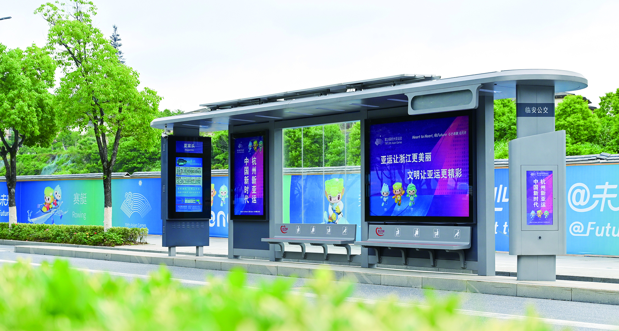 “迎亚运盛会 讲文明风采”“共建文明城市 共襄亚运盛会”……城中街、钱王街、九州街等主干道两旁,迎亚运标语迎风而立。石山亚运山地公园前,“琮琮”“莲莲”“宸宸”的身影活跃其间。公交车站大屏、地铁外围也陆续换上“绿色低碳,相拥亚运”的公益宣传海报,公交车成了“行走的亚运宣传大使”,车内的广播已更换为中英双语。