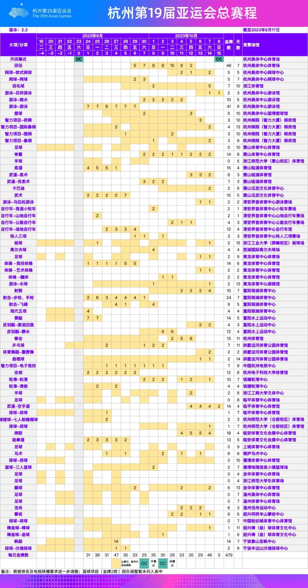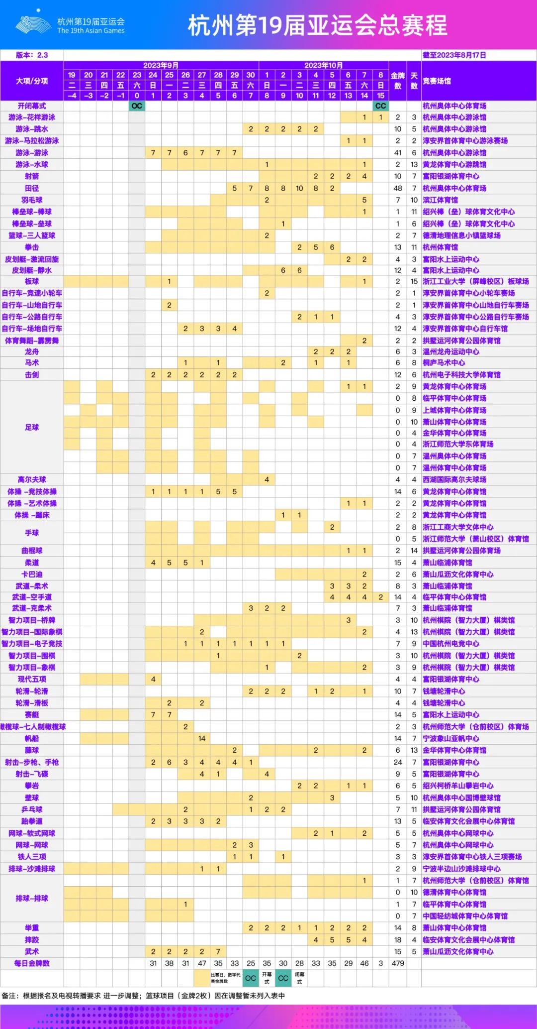 杭州亚运会总赛程更新至2.3版。总赛程2.3版对足球、排球等10项比赛的天数及日期更新调整,羽毛球、拳击金牌分布有所调整。