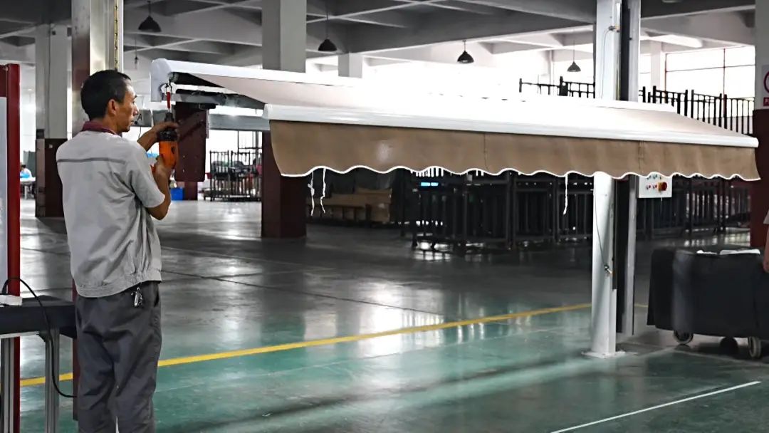 走进企业的生产车间,只见各类机器高速运转,工人有序忙碌,冲孔、喷塑、组装,大家忙得热火朝天。企业负责人介绍,遮阳篷是季节性产品,通常来说现在正处于企业的接单旺季、生产淡季,但是上月底欧洲和北美市场的客户临时联系,增加了1.5倍的订单。