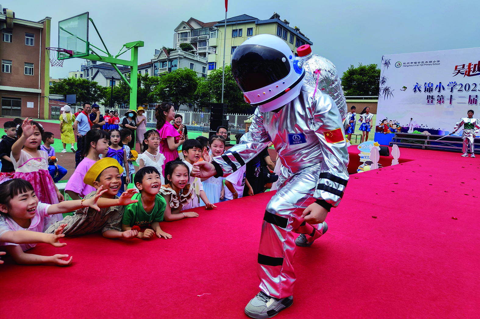 1日,在衣锦小学,一场从过去穿越到未来的时装秀正在上演。孩子们沉浸在古装与太空服之中,全校师生在这场走秀中共同度过了一个欢快的六一。