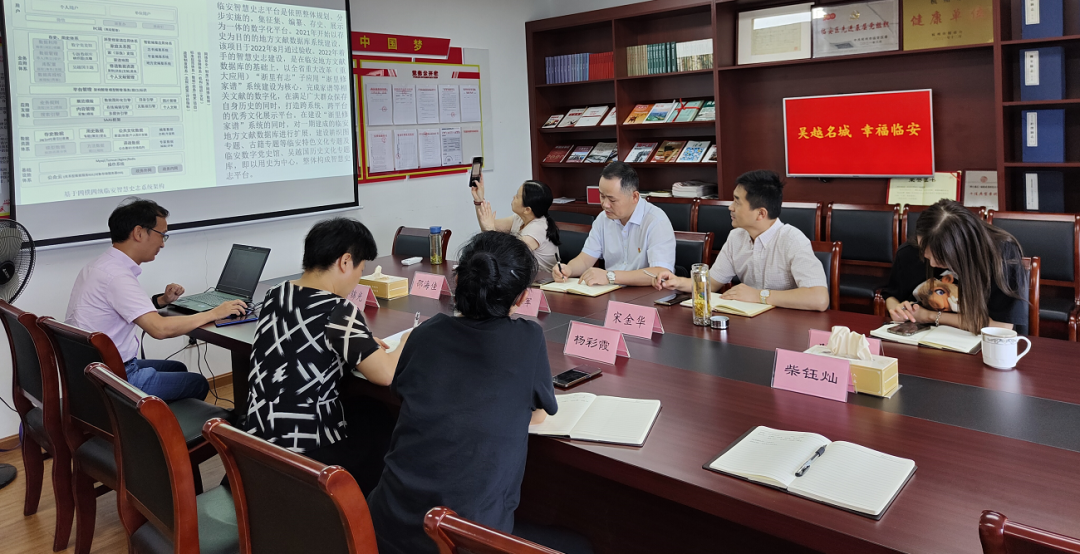 会上,许月琴副主任简要介绍单位总体情况和史志数字化建设的基本情况;许锦光科长详细介绍史志数字化建设已取得的成果和下一步的工作计划,并谈了在数字化建设过程中遇到困难和不足。海盐县档案馆(史志研究室)党组成员徐永军表示临安作为全省方志数字化建设工作的试点单位,经验和做法值得学习和借鉴,希望双方今后能加强交流和学习,共同提高。随后,双方分享了在修志编鉴工作过程中的具体做法和经验,为新一轮志书的启动做好准备。