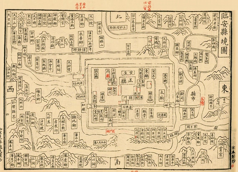 当衣锦军成为和杭州、湖州、睦州等十三个州平级的建制单位,当时还存在临安县城吗?或者说,衣锦军是不是和临安县城并置存在?文献资料上对临安县城的具体描述几乎没有,史料上有的是关于临安县治的变迁史,宣统《临安县志》卷一中说:“宋前建高陆,至今石碑尚存,宋景定间,令家之巽移建西墅保锦山,明洪武初,令袁思谦置东市太庙山右,国朝仍之。”从高陆到西墅再到“东市太庙山右”,县治几经变迁,而“宋前建高陆”说明五代时的县城和衣锦军存在并列关系。《咸淳临安志》第十六卷上说:“临安县县治,在钱武肃庙西,岁久不葺,景定三年,令家之巽建有秋轩及元祐学堂,咸淳二年,令赵汝棣重建堂屋、门庑。”如果说洪武初临安县治在“东市太庙山右”,那么在景定之后的咸淳期间,县治在西墅保锦山,似乎也符合“在钱武肃庙西”的说法,《咸淳临安志》中的“临安县境图”,是目前可见最早的临安地图,在这张图中并没有在西墅保锦山位置标注县治,而是在衣锦城的位置标注了堂屋、正厅、县门、县学、县仓等县府机构,那么由此是不是可以判断当时的县城就是衣锦城旧址?按此推算,是不是吴越国时只有衣锦军而没有县城?