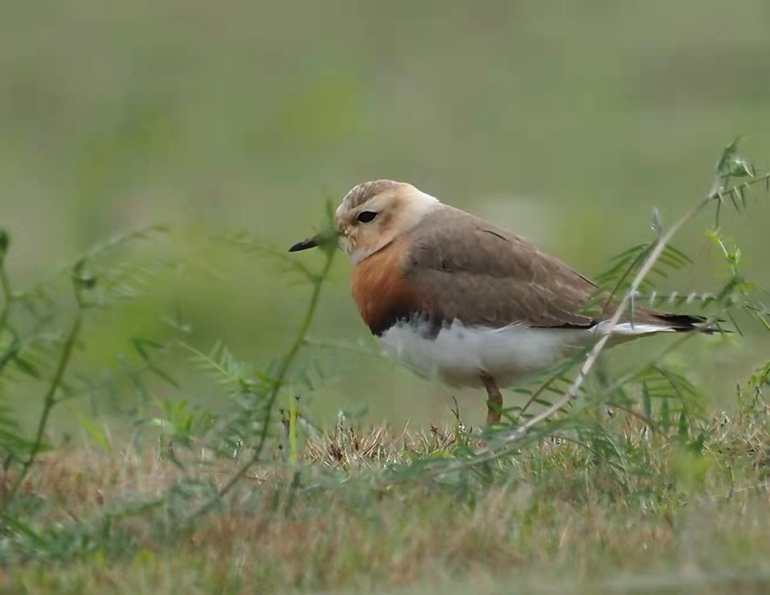 赵金富带领记者靠近青山湖绿道,把他的奥林巴斯望远镜递给记者,他架起相机。远处湖对岸南绿道一个凉亭下的石矶上,正歇着两只苍鹭和四只鸬鹚。近处的水面上,三只鹈在嬉戏、潜水。眼前的人工草地上,不时有小鹀、珠颈斑鸠、红喉鹨、大山雀、金翅雀,飞来栖息、觅食和相互追逐。这些常见的鸟,对赵金富来说,没有太大刺激。他更多带着一种为我扫盲的耐性在普及常识。这时两种美丽的鸟飞来了,一种是金眶鸻,另一种是东方鸻。