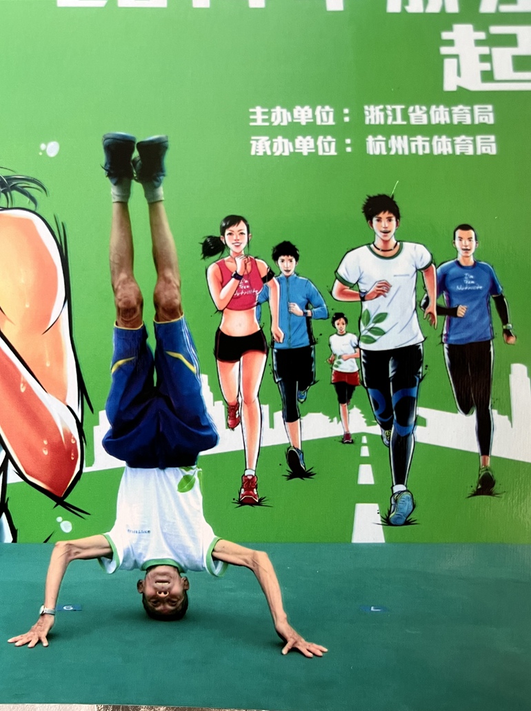 和着鸟鸣,葫芦丝悠扬的曲调和抒情的歌声,飘荡在田螺山的上空,94岁的周行义也以这样“自我陶醉”的方式开启了运动的一天:早晨,他要用一个小时的时间完成跑步、倒立;午后,他要骑上那辆山地车来到距离家不远的苕溪,然后下水游泳,自由泳、蛙泳和仰泳是他必游的三个姿势,每个姿势划水50下,而且边游泳边唱歌,最后在与众不同的“摇橹式”仰泳中结束一天的水上运动……跑步、倒立、骑车、游泳,每天的每天,周行义都坚持锻炼这一套“水陆空”,每天的每天,他也都要完成一个微型的“铁人三项”,正是有每日的必修课相伴,周行义神采奕奕,活力四射。